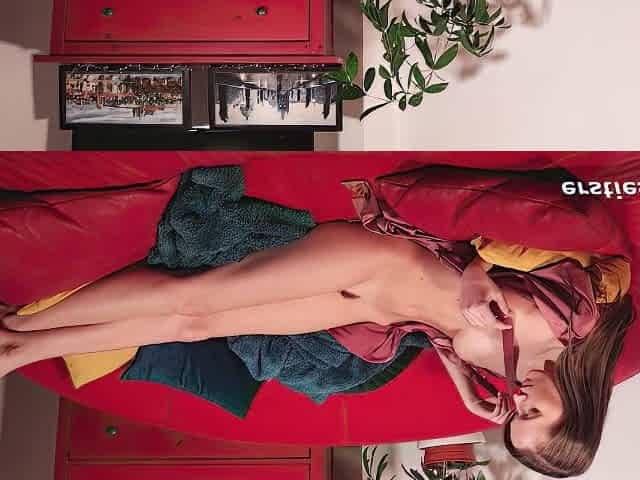 Berta Masturbates on the Sofa in Lacy Red Stockings