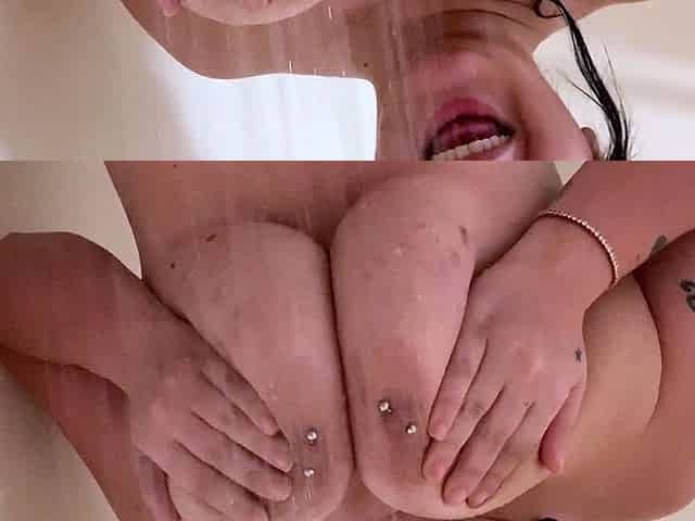 Busty babe playing with her big boobs