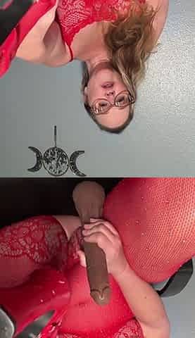 Young Girl in Red Latex Lingerie Seductively Plays with Dildo