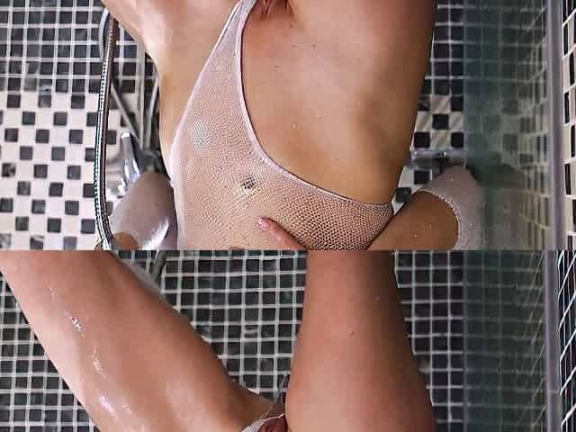 Showering hottie Fibi Euro nicely plays with her shaved pussy