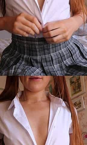 Teasing redhead teen in white stockings stripes on bed