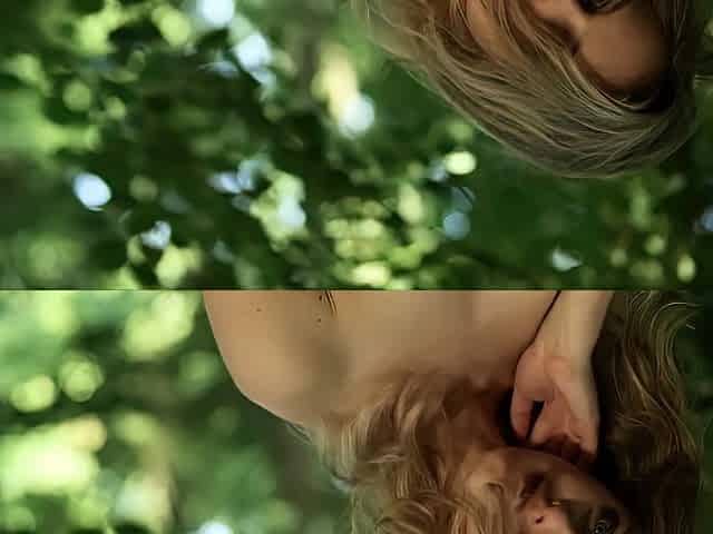 Outdoor solo masturbation scene with curly blonde