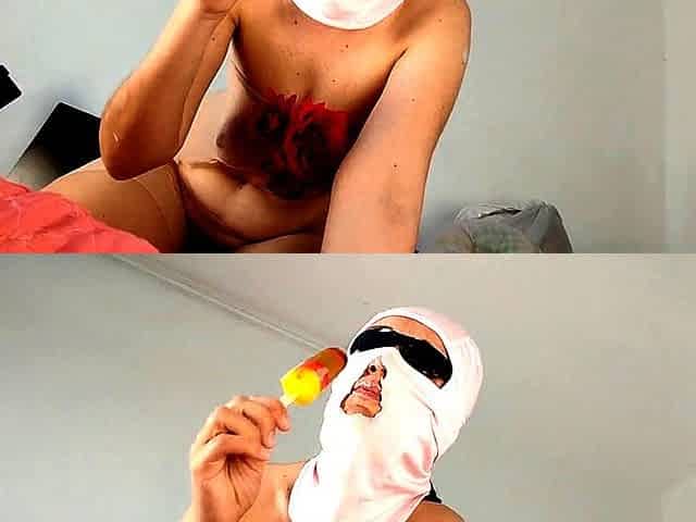 Amateur brunette Mirsur enjoys licking a popsicle and trying on clothes she cuts