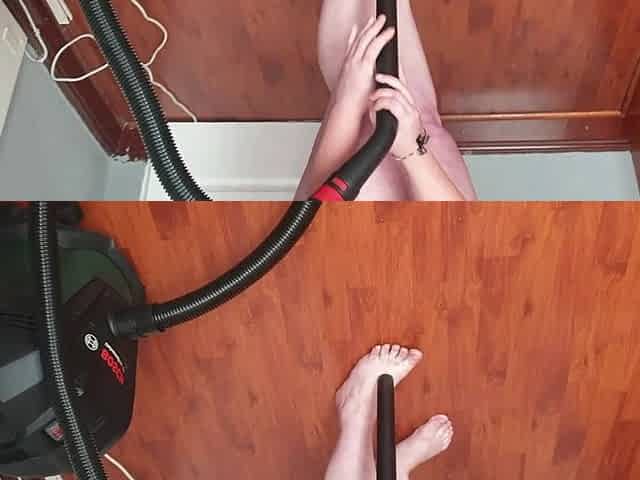 Pigtailed pale BBW gets undressed to vacuum suck her big boobs and fat pussy