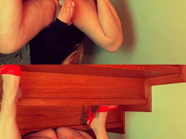 Golden-haired bitch masturbates during training and squirts in her yoga panties