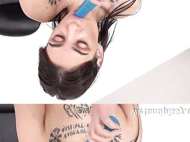 Squirting tattooed girl Alexa Throat stimulates her shaved pussy