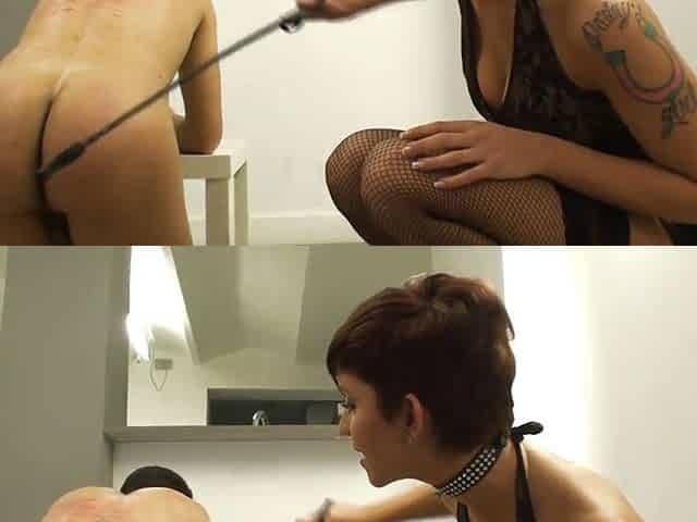Ballgagged redhead submissive dyke whipped by Ebony domina