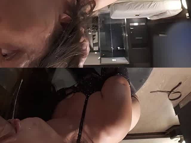 Tractable cutie in wardrobe sucks dick, licks cum and is spanked
