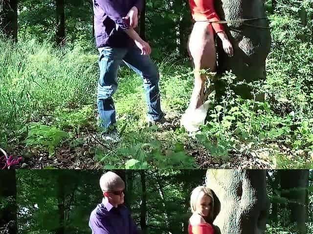 Slave tied to tree gets her ass spanked
