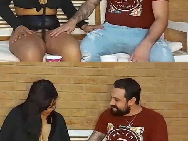 Wife spit roasted in lingerie / Husband finishes in mouth