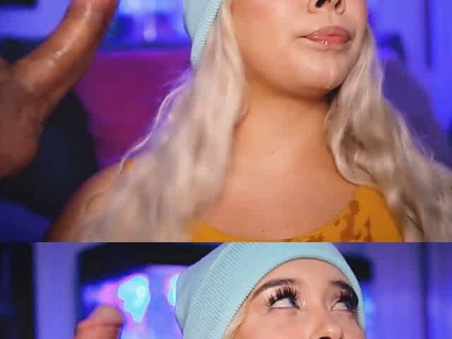 Blonde babe with a cute face enjoys sucking her boyfriend's cock while sporting his boxers