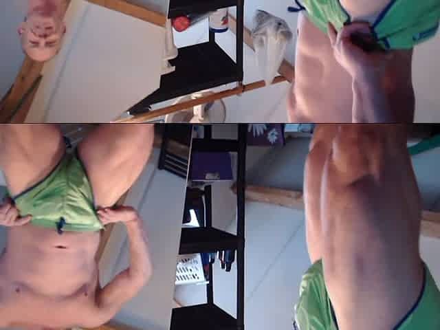 Justin flexes his muscles in front of the mirror, sporting a huge cumshot.
