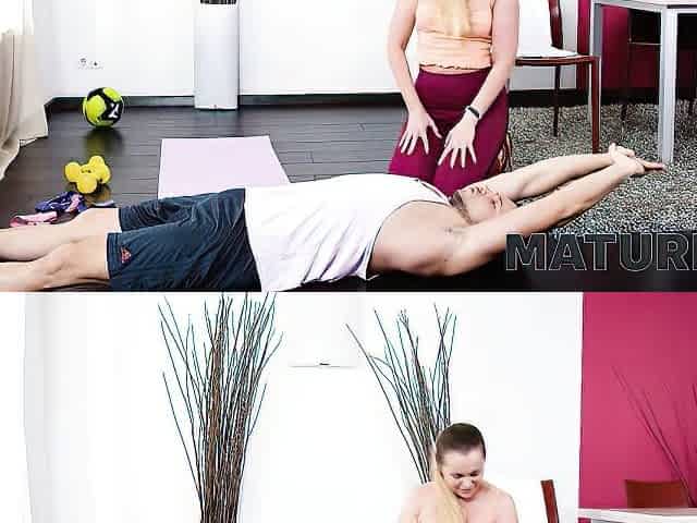 "MATURE4K. Fitness trainer fools around with older woman during workout"