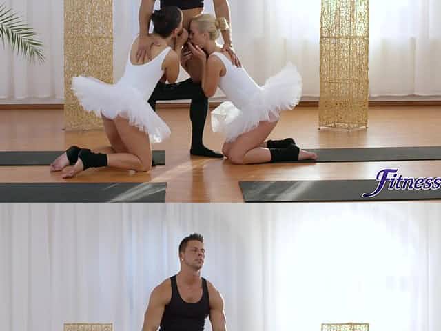 Sportive babe spitroasted by sport instructors