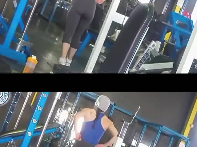 A spy cam in the sports club changing room takes the view of a milf's thighs and pussy