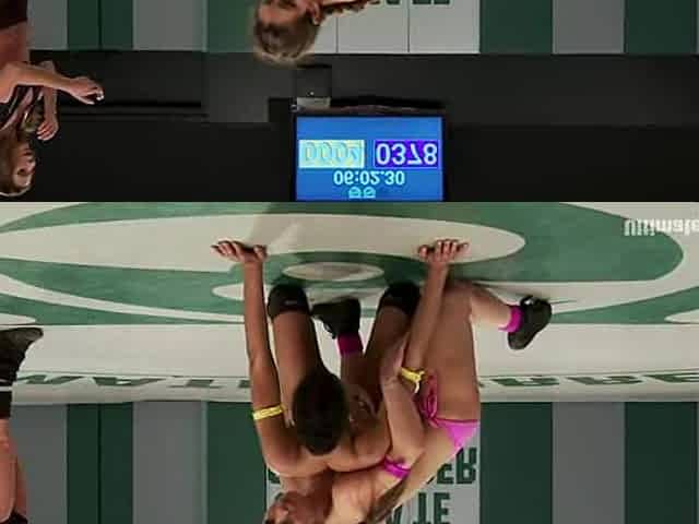 Four horny lesbians rub each other's cunts during a fight on tatami