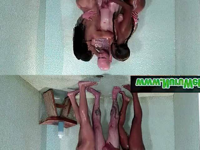 2 black masseuses sharing client overspread in nuru gel