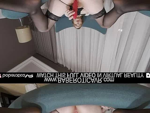 "Solo brunette in black stockings masturbates with spread legs in VR."