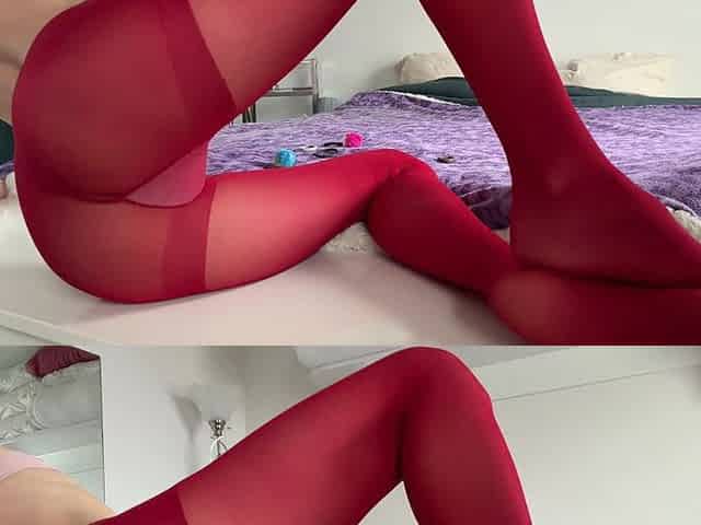Red Nylons Strip to Rear Pussy Spread