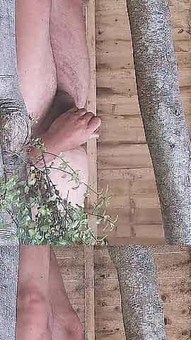 Secret morning stroke with uncut knob behind a tree so the neighbours couldn't watch