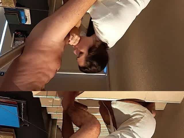 Gorgeous busty brunette babe cleaning stuff with downblouse, Amazing brunette babe with nice all natural tits cleaning the stair