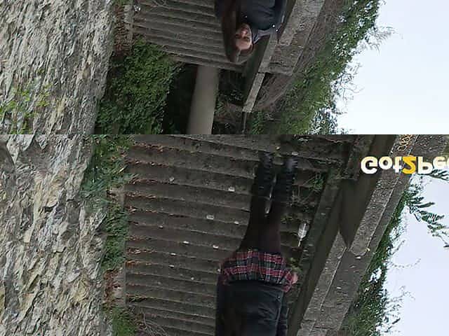 White freak fucks his leggy Asian bitch in flying pose on stairs