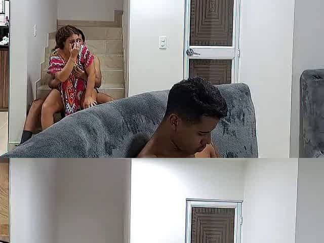 Horny couple gets caught fucking hard on the stairs by a hidden camera
