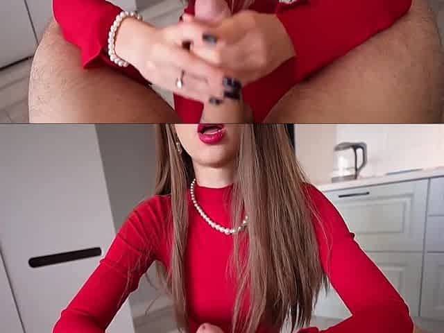 Gorgeous stepmom gives handjob in POV in the kitchen