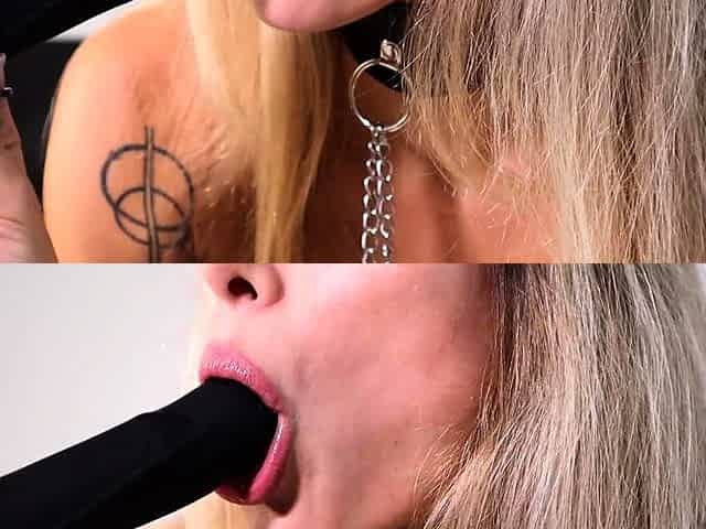 Topless teen Gina Gerson enjoys solo oral pleasure with a large black dildo