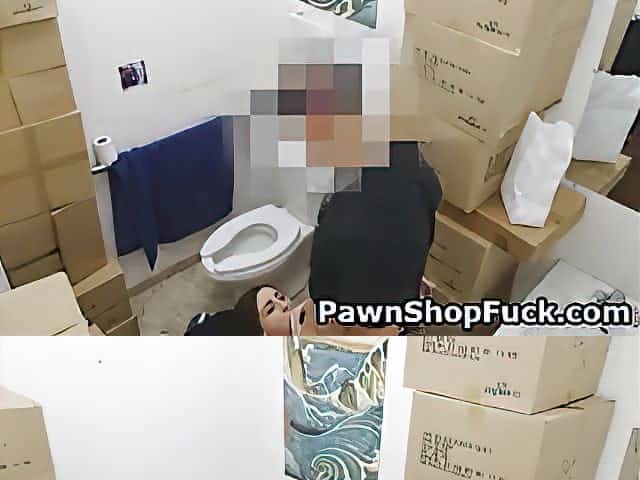 Brunette babe sucks cock in a pawn shop bathroom