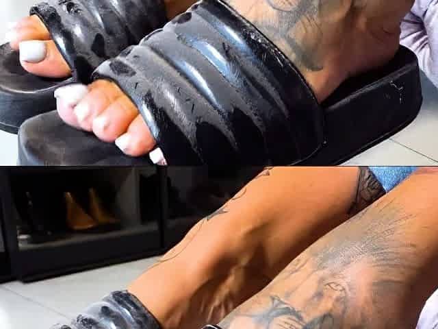 Brown-skinned babe with tattooed soles satisfies foot fetish