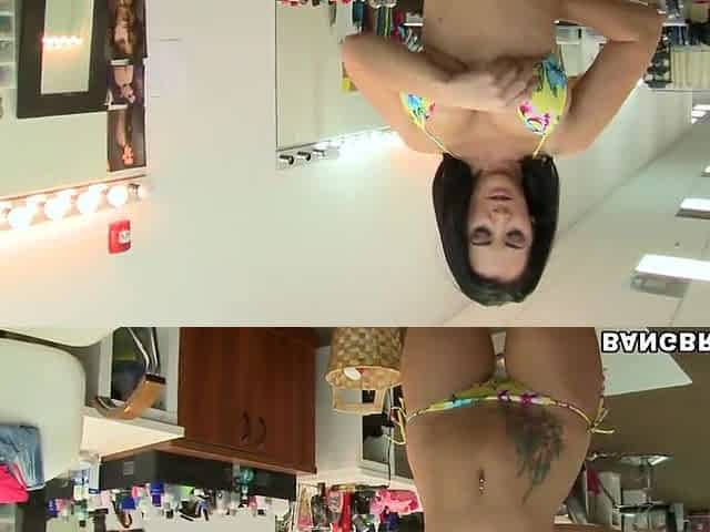 Skinny leggy brunette Katya Clover masturbates in a bikini store in fitting room - solo teasing in bikini