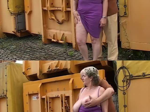 Corpulent blond woman with large milk jugs is having a lot of joy with a stranger