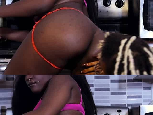 BAZOOKAS PLAY and sex toy BANGING with belt-on - latex fetish and food play - servitude screwing yielding