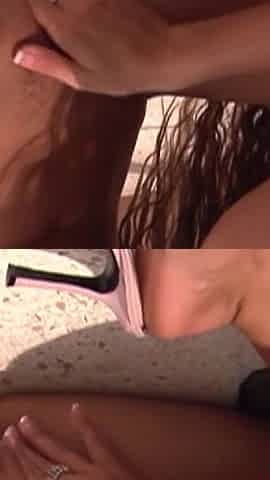 Platinum Blonde Sluts Sharing Strapon Toy by the Pool
