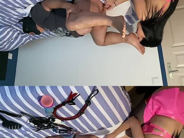 Domme Mistress Flame gets her slave ready for pegging and deep throat action