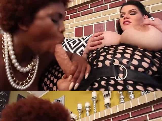 Femdoms wearing latex pegging slave and seducing his cock