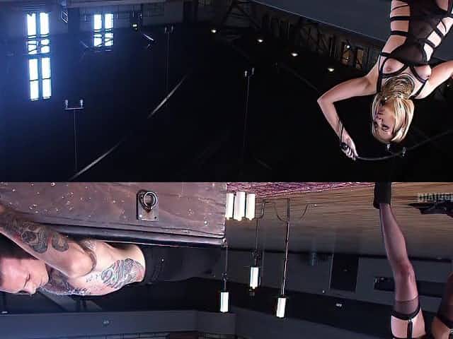 Harmony and Nomad. Latex clad Harmony Rose sinks her teeth into trussed up nomad's hard, bound cock and he doesn't know whether