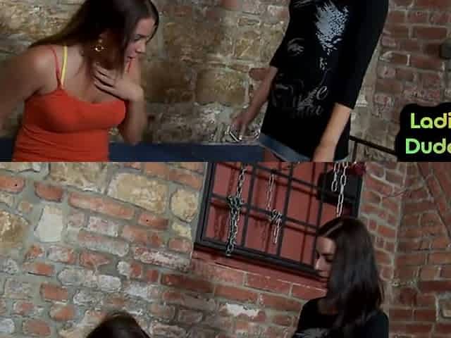 Pegging 21yo femdom chicks fuck guy in dungeon 3some