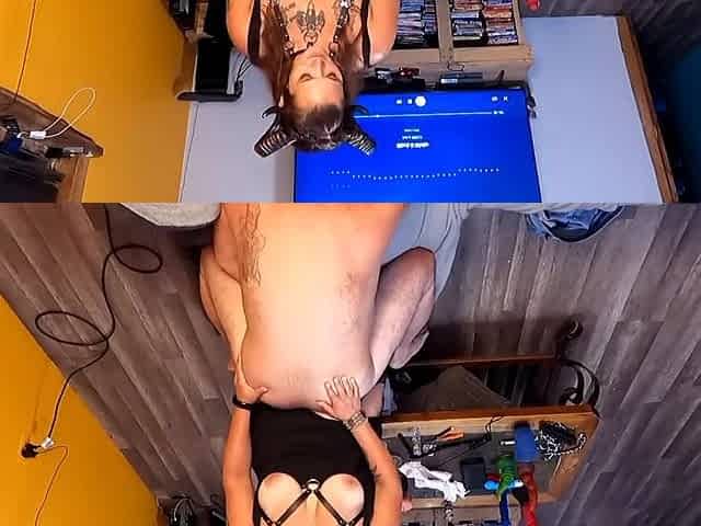 Tattooed domina strapon tying sub to cum in her hand