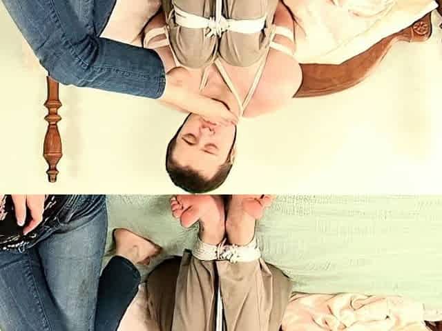 Mistress Punishes and Fucks a Slave Tied by the Legs to the Bed