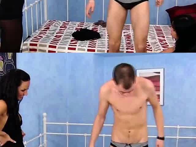 Femdom fetish mistresses fuck bdsm loser with strapon