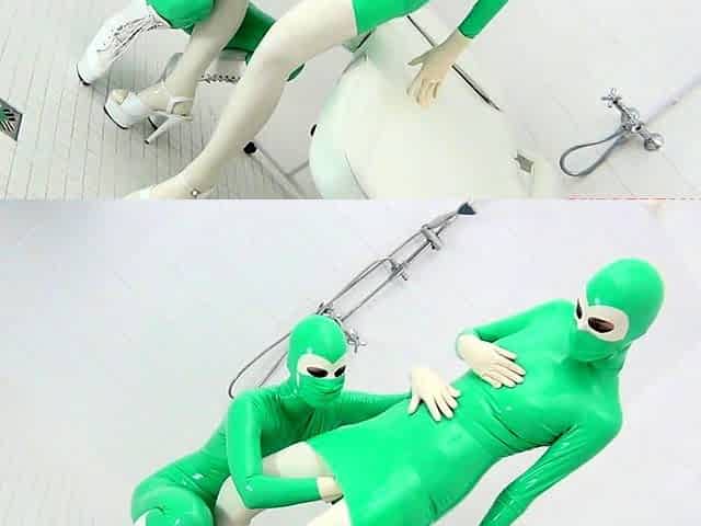 Latex lesbian strap-on fuck
