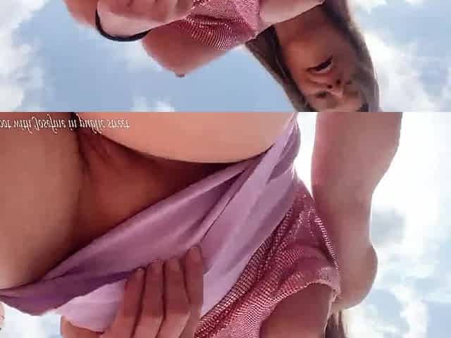 Public upskirt view of brunette beauty Olivia pleasuring herself