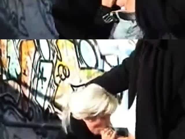 Blonde in black knee socks gets down on her knees to suck a guys dick on the street