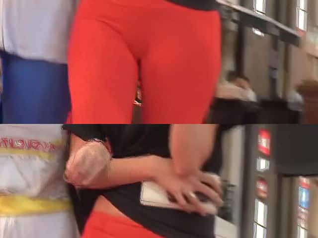 Street candid video with sexy blonde in red pants