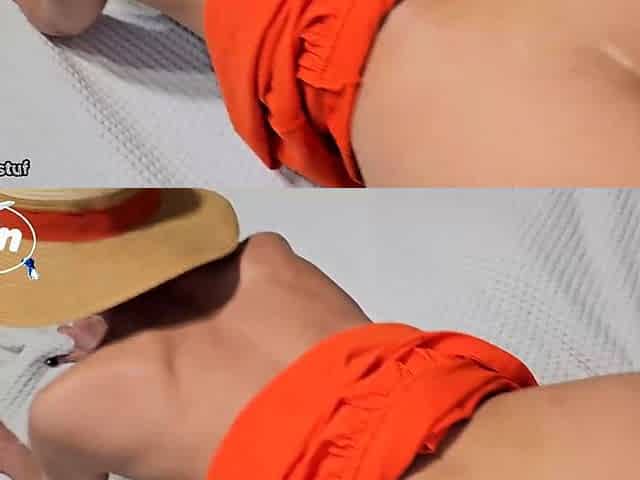 Real-life beauty with natural tits, wearing a costume, masturbates.