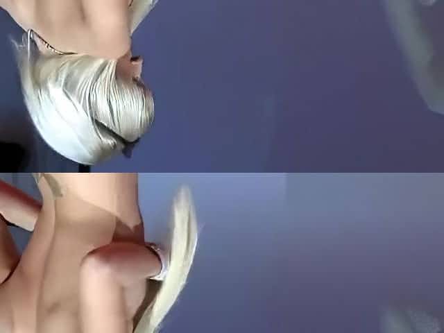 Petite blonde stripper with mesh gloves pounds herself on stage