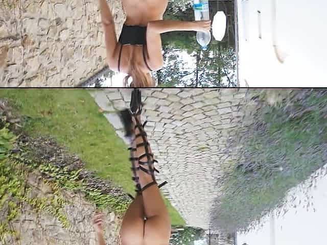 Skinny blond Russian cougar disrobes bare outdoors to expose her bubble booty