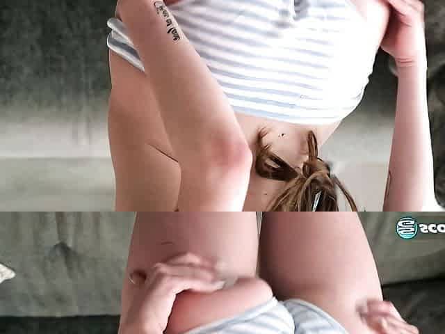 Good blonde chick with round ass Caty Kiss touches her shaved pussy